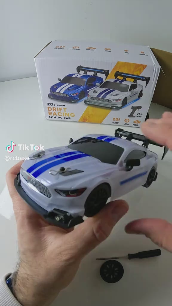 You'll get the RC drift car, remote controller, rechargeable battery, USB charging cable, and extra drift tires. Everything you need to start drifting right away!